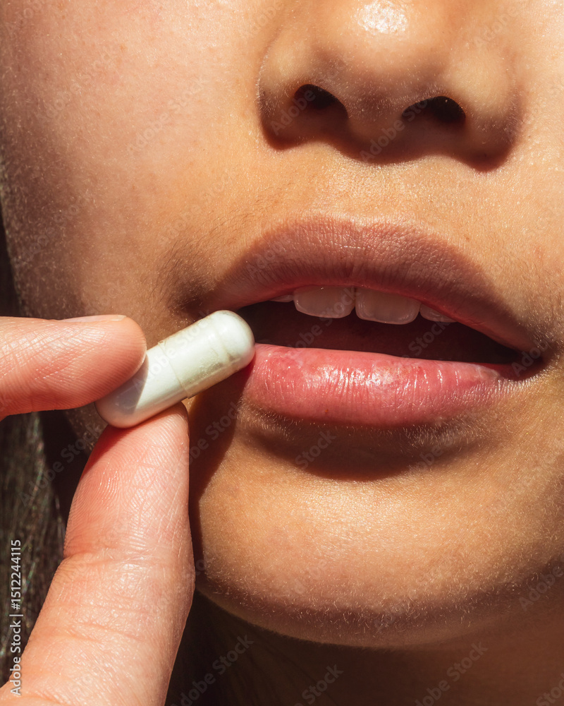 Tableau sur toile Close up shot of woman taking a supplement vitamin