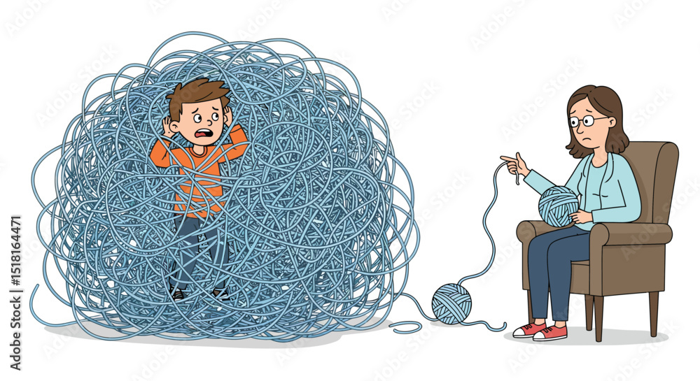 Tableau sur toile Boy Trapped in a Tangled Ball of Yarn Woman Knitting Nearby