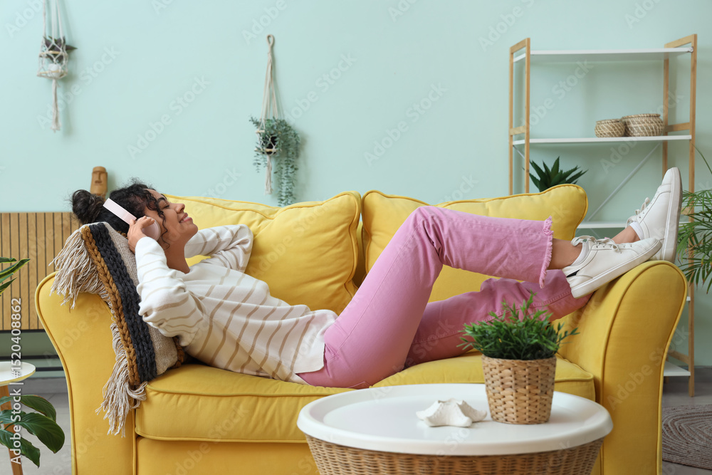 Tableau sur toile Beautiful young happy African-American woman in headphones listening music on so