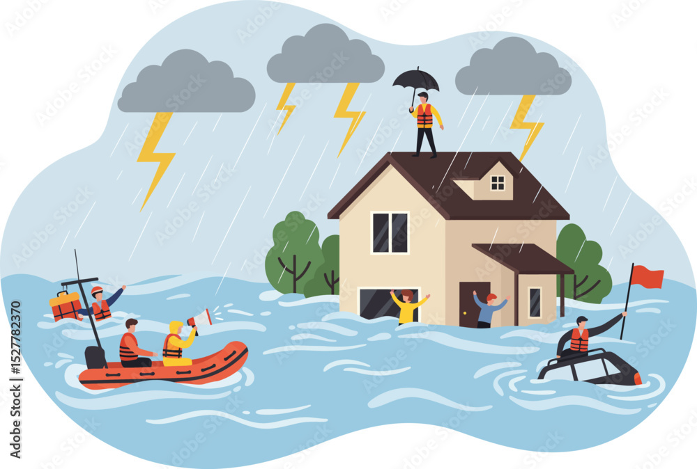 Tableau sur toile Illustration natural disaster floods and rescuers are evacuating those trapped in the floods