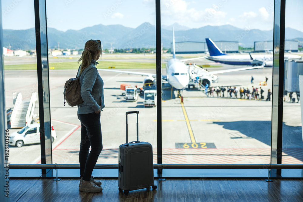 Tableau sur toile Woman with suitcase waiting at airport terminal before boarding airplane, solo t