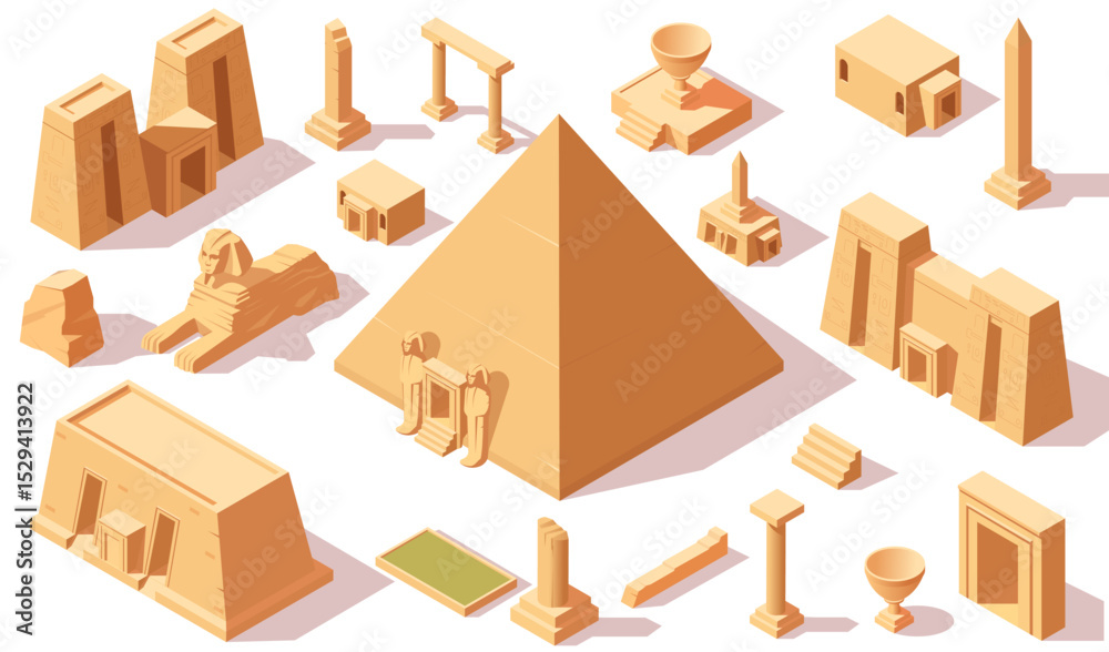 Tableau sur toile Collection of ancient Egyptian buildings and monuments in isometric style on white background