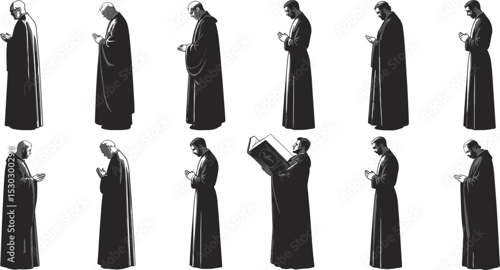 Tableau sur toile Set of praying monks in robes, vintage religious illustrations, black and white