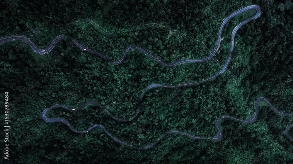 Tableau sur toile aerial top view beautifull curve road on green forest in the rain season backgro