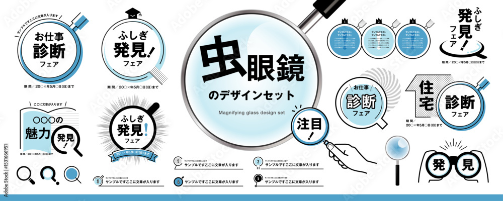 Tableau sur toile シンプルな虫眼鏡のデザイン素材セット(フレーム、タイトル、見出し、拡大鏡、ルーぺ、サーチ)/青色