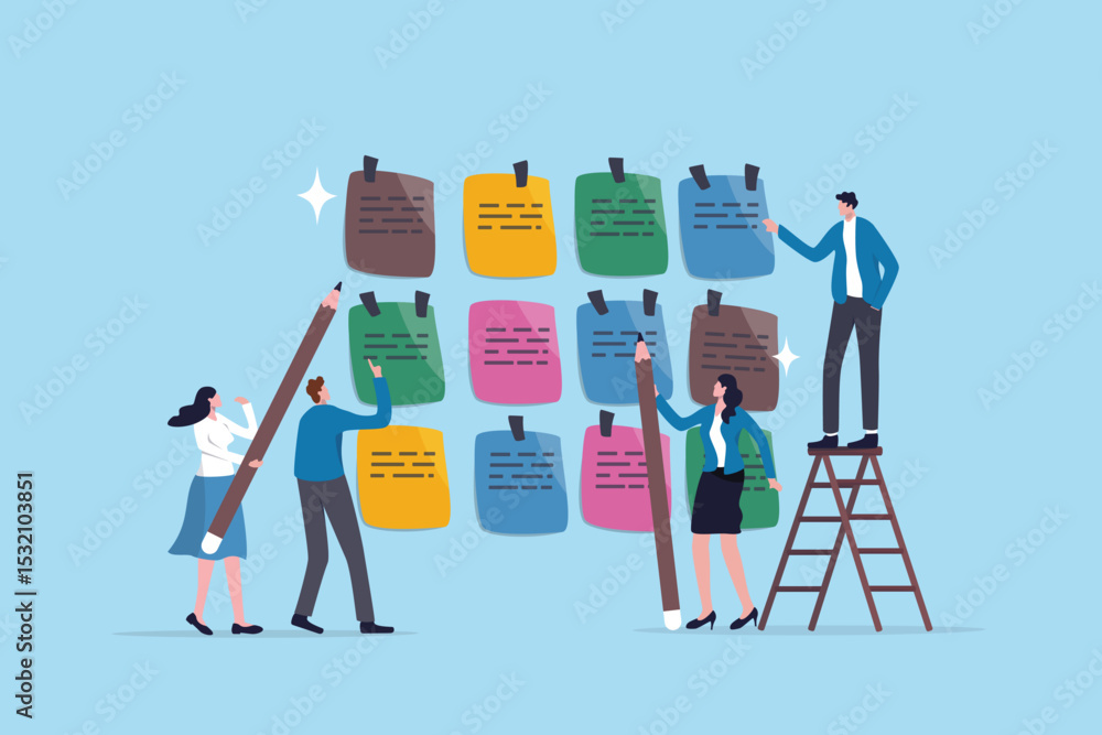 Tableau sur toile Agile scrum, sprint or idea brainstorming, teamwork planning development meeting, team meeting workflow or improvement feedback, business people team brainstorm and discuss on sticky notes