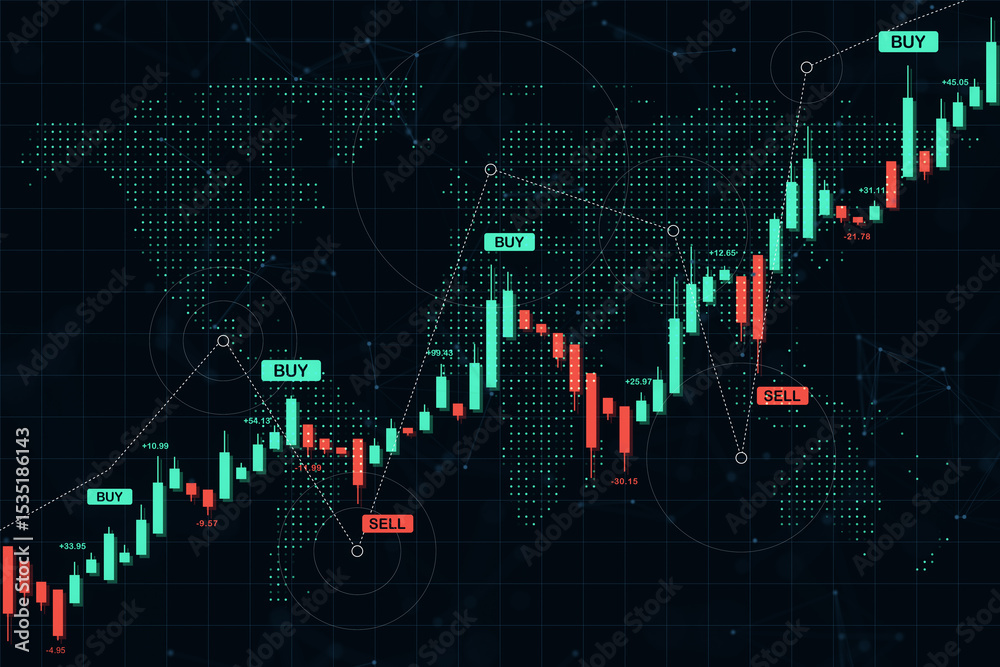 Tableau sur toile Digital candlestick chart with buy and sell signals over global map background for financial market analysis and investment display template