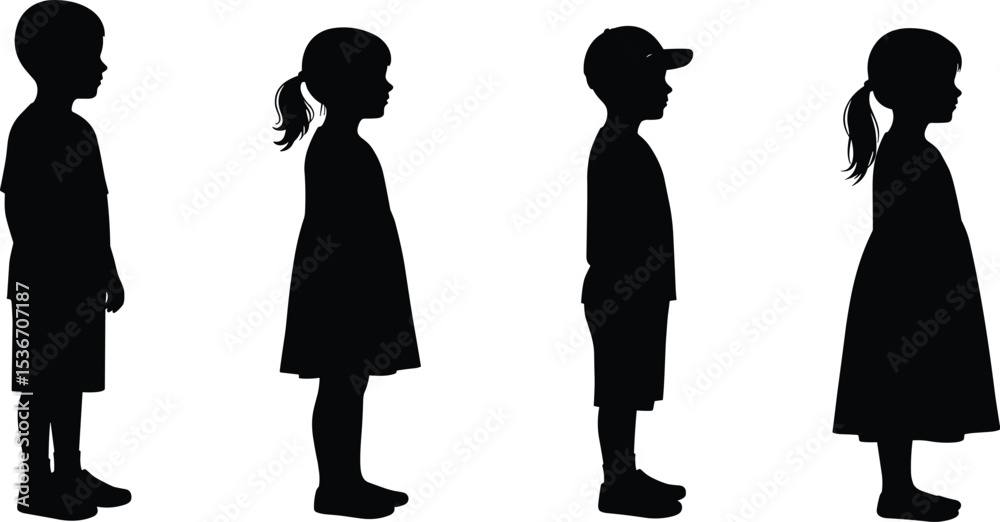 Tableau sur toile Silhouette of kids standing in side view, black vector illustration of boy and g
