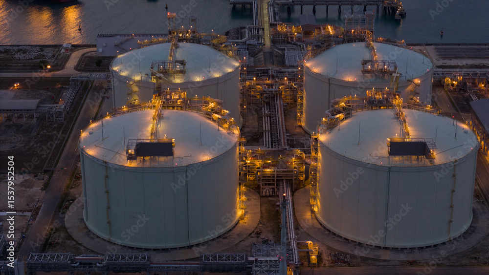 Tableau sur toile LNG storage tanks and terminal facility at dusk, showcasing large cylindrical containers, offshore piers, and cargo ships
