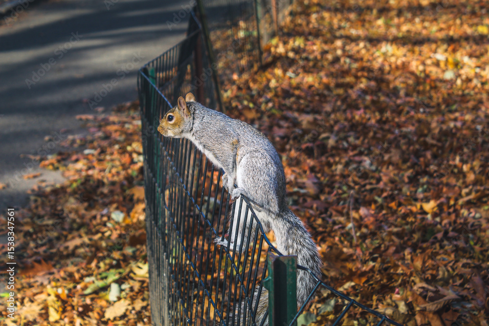 Tableau sur toile A gray squirrel perches on a fence in Central Park, New York City