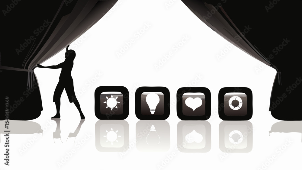 Tableau sur toile Silhouette figure opening black curtains revealing icons of sun bulb heart and r