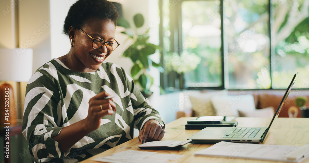 Tableau sur toile Happy, black woman and finance with laptop for payroll, tax return or budget planning at home