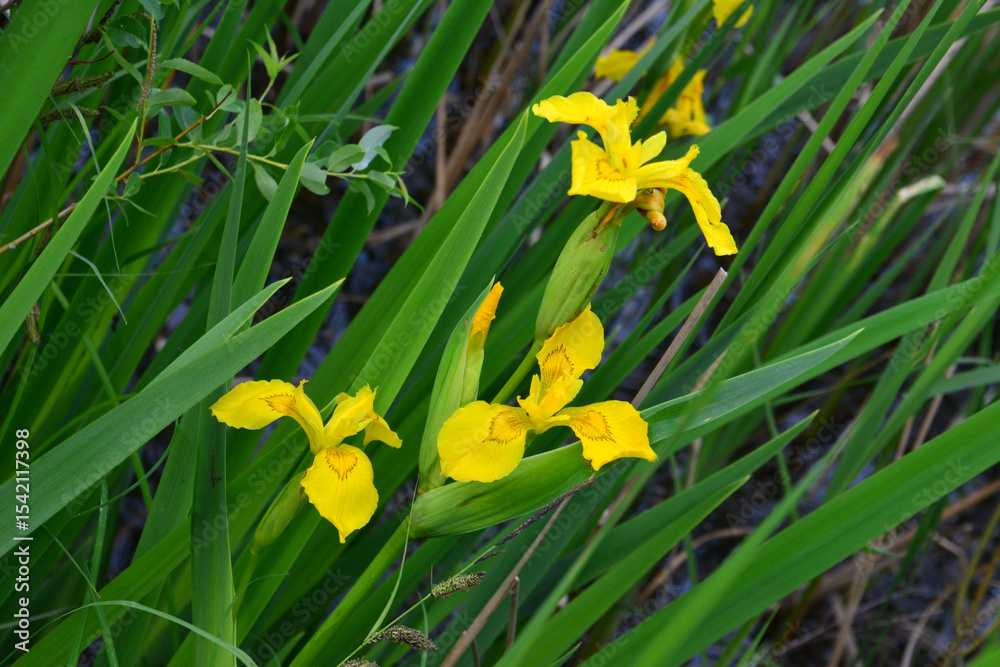 Tableau sur toile three flowers of Yellow Flag Iris in Bloom among green grass