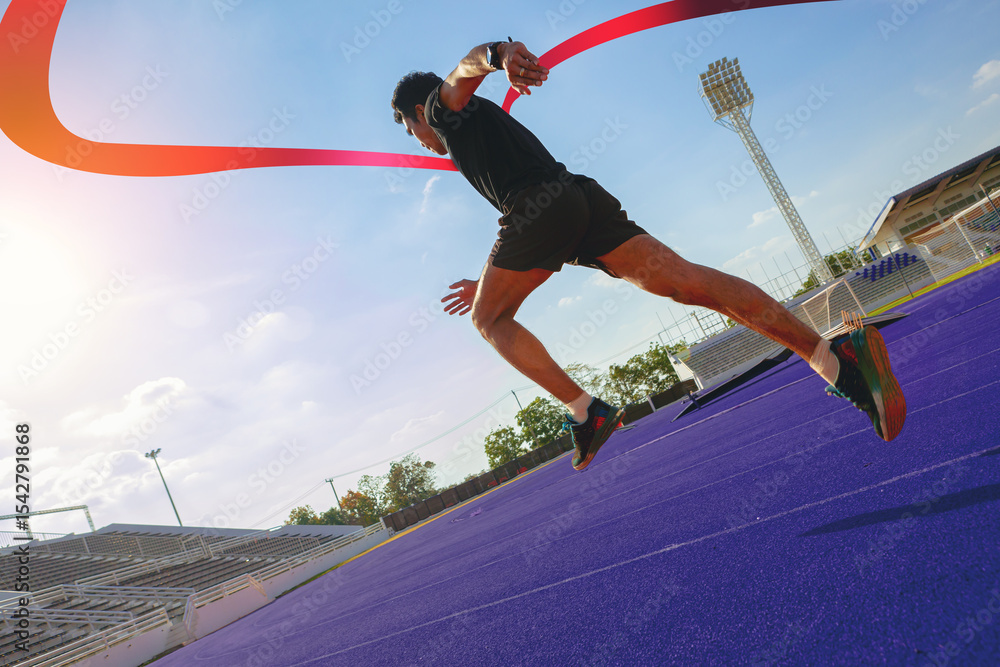 Tableau sur toile Fit young man running sprinting to red finish line at the racetrack