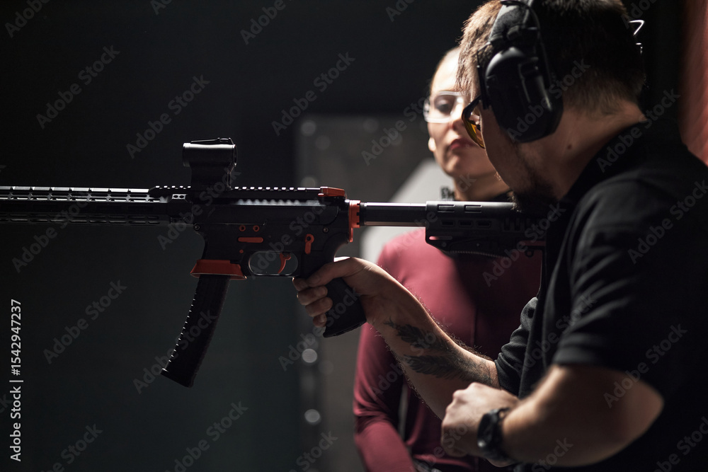 Tableau sur toile Man wearing protective earmuffs instructing Caucasian young woman on holding rif