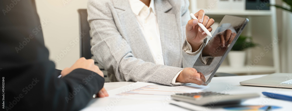 Tableau sur toile Financial consult planning investor asses and present to client, Close up shot client and advisor review investment strategy in the office