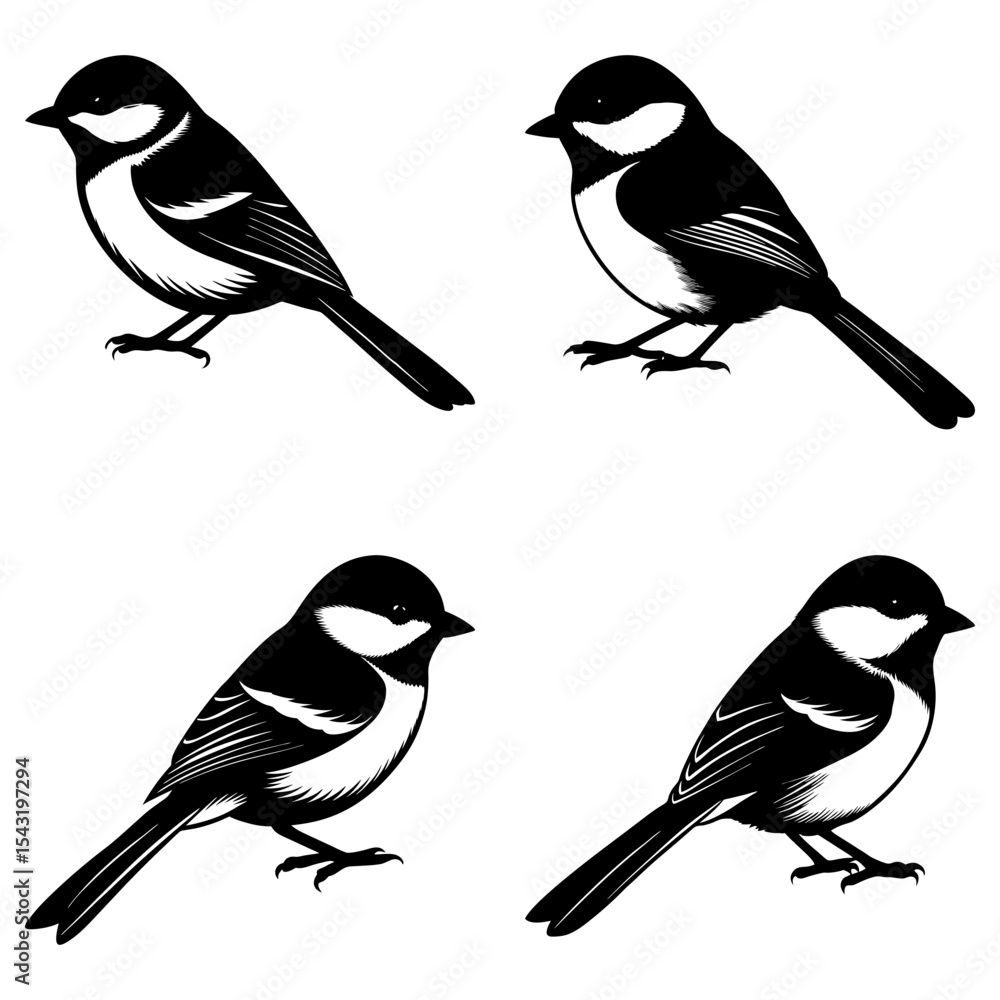 Tableau sur toile Four black and white chickadee birds in various poses isolated on a white backgr