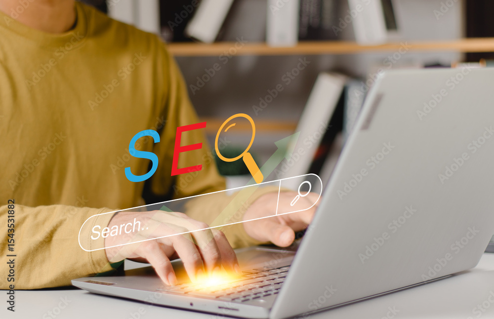 Tableau sur toile SEO optimization with a laptop, utilizing a search engine interface and digital tools for boosting website traffic and improving online visibility in a modern workspace