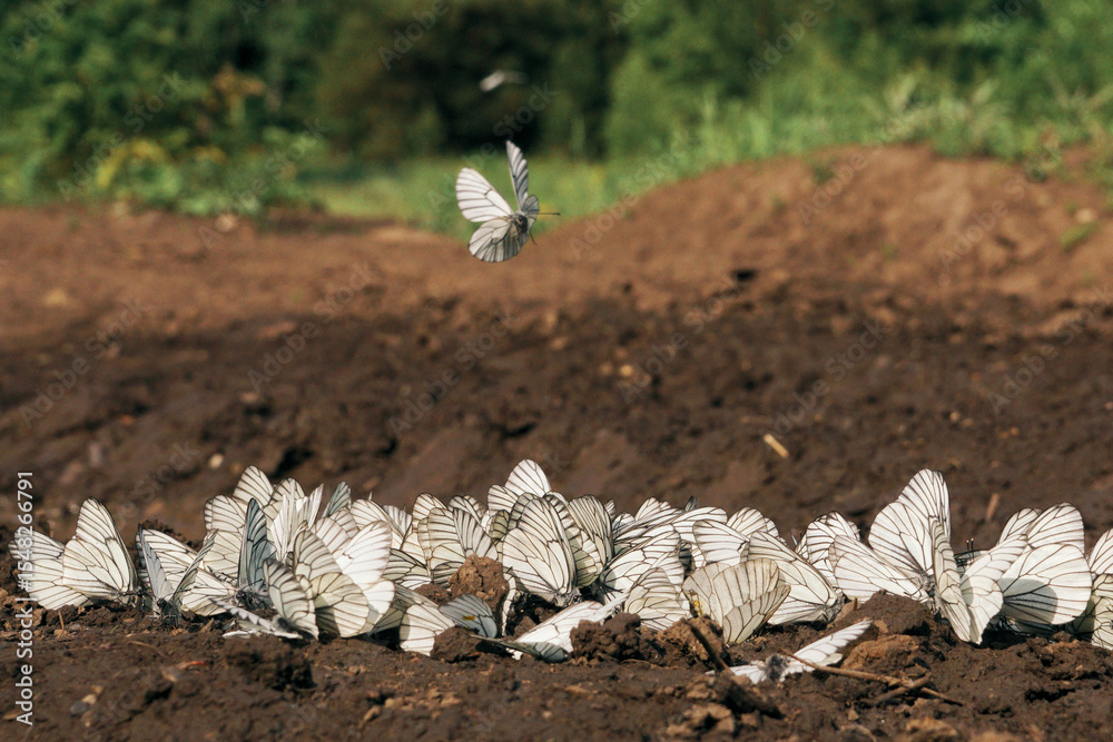 Tableau sur toile White butterflies are sitting on the ground. Aporia crataegi