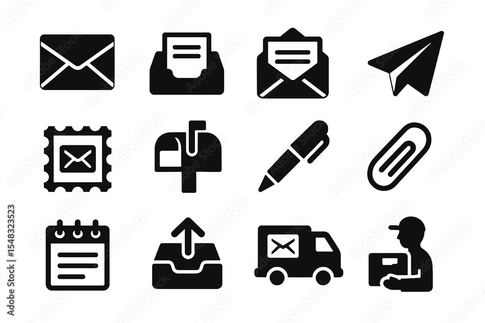 Tableau sur toile Set of mail and delivery icons including letters, parcels, envelopes, pens, and postal services in solid black style