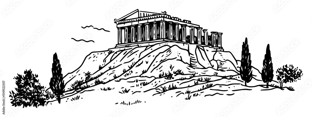 Tableau sur toile acropolis parthenon on hill – monochrome outline vector of greek landmark