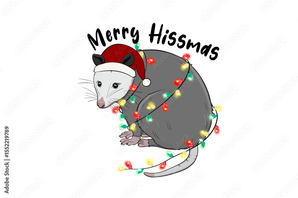 Tableau sur toile Merry Hissmas – Illustration of an opossum wearing a santa hat is tangled in Chr