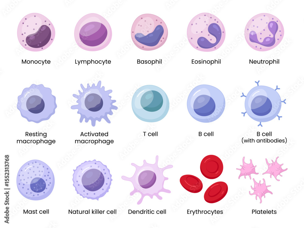 Tableau sur toile Vector illustration depicting human immune cells, including macrophages and mast cells, showcasing the biology of the immune system and monocyte types in immunology