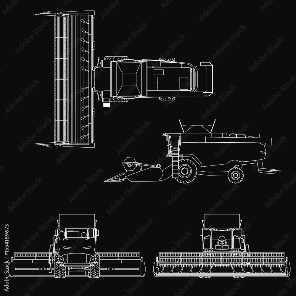 Tableau sur toile Detailed blueprint of a combine harvester on a black background, featuring front, back, and side views