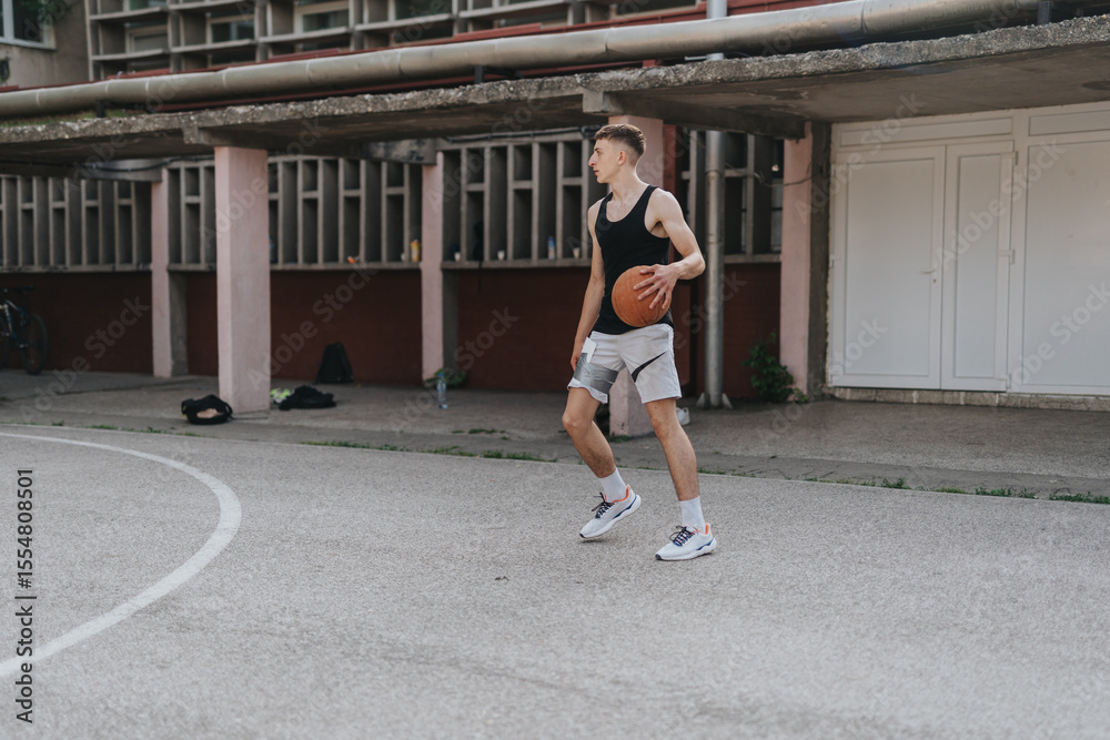 Tableau sur toile Friends playing basketball at an old neighborhood court, emphasizing camaraderie, athleticism, and the nostalgic charm of urban play areas