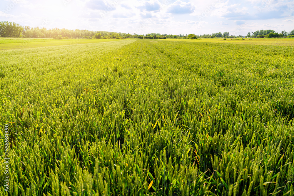 Tableau sur toile Green cereal field with young grain ears in mid-season
