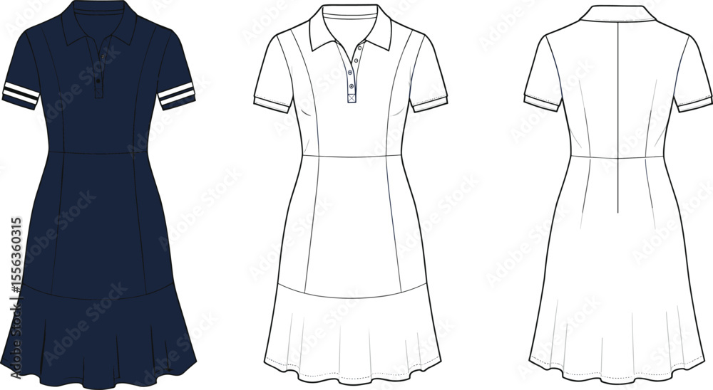 Tableau sur toile Short sleeve pleated dress with collar front and back, cad drawing flat vector i