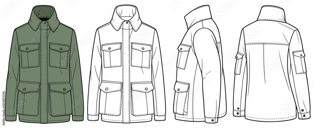 Tableau sur toile Classic Field Jacket Flat Sketch, Men's Outerwear Design with Multiple Pockets and Collared Neck, Fashion Apparel Template for Casual and Utility Wear