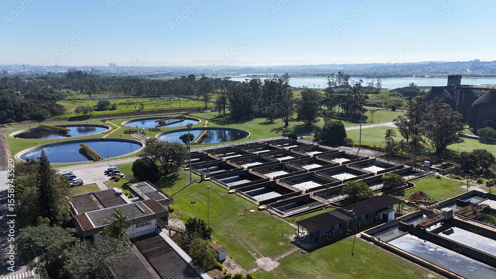 Tableau sur toile Imagem aérea de uma planta de saneamento com destaque para o lodo ativado, ilust