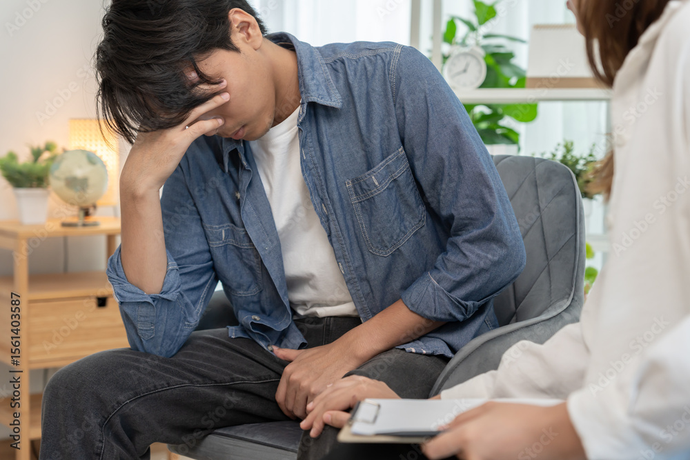 Tableau sur toile Man hold hand in front of private parts feeling discomfort and consult doctor