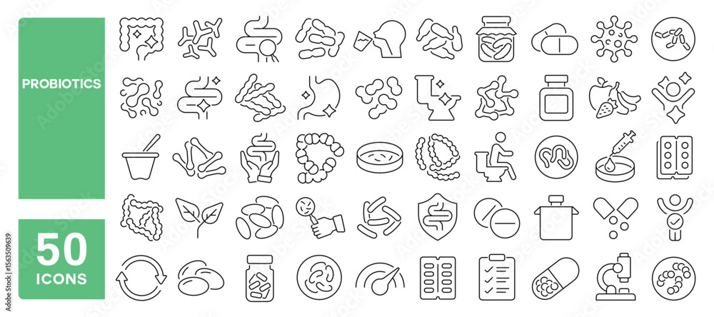 Tableau sur toile Set of 50 line icons related to probiotics, bacteria, intestines, microbe, digestion, prebiotic, Editable stroke