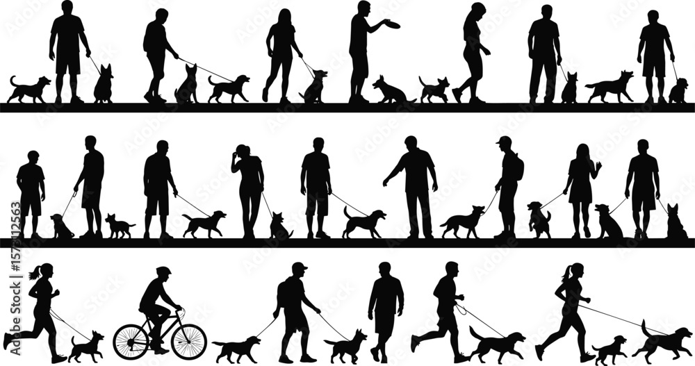 Tableau sur toile Silhouettes of people walking dogs, jogging, biking, playing, interacting with p