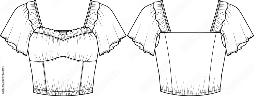 Tableau sur toile CAD cropped top sketch, ruffled neckline design, short puff sleeves, gathered he