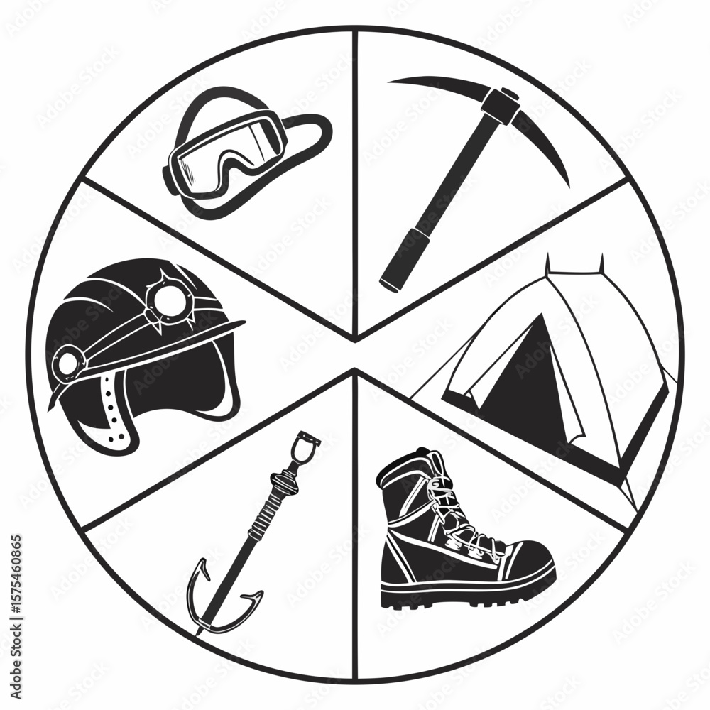 Tableau sur toile Climbing gear icons helmet goggles ice axe tent boot grappling hook mountaineeri
