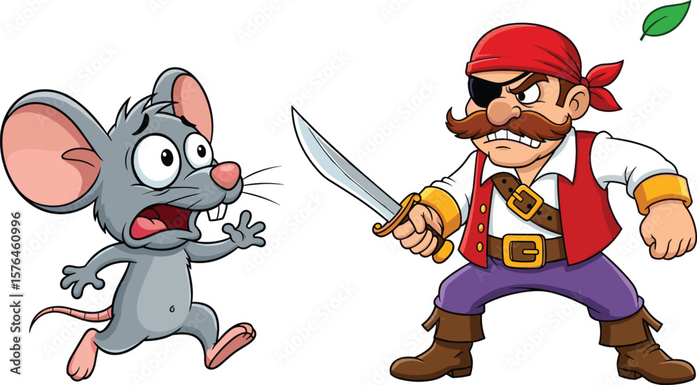 Tableau sur toile Angry cartoon pirate with sword chasing scared mouse, funny vector illustration,