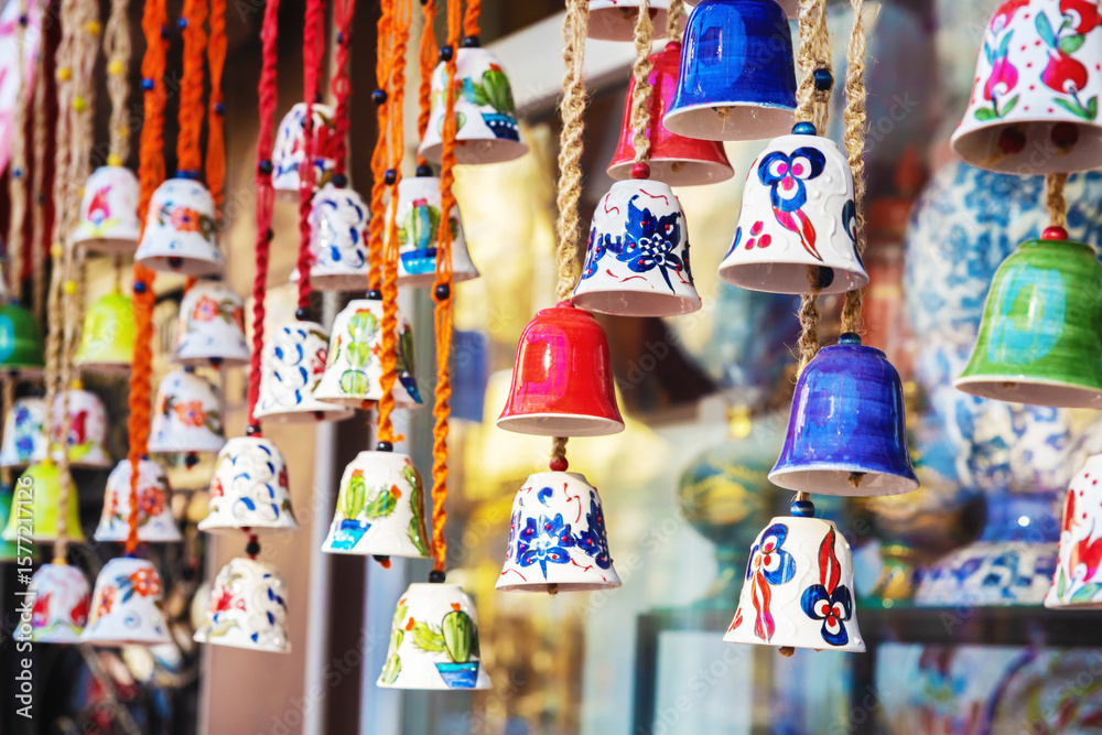 Tableau sur toile Colorful traditional Iznik ceramic bells as souvenirs displayed in market shop i