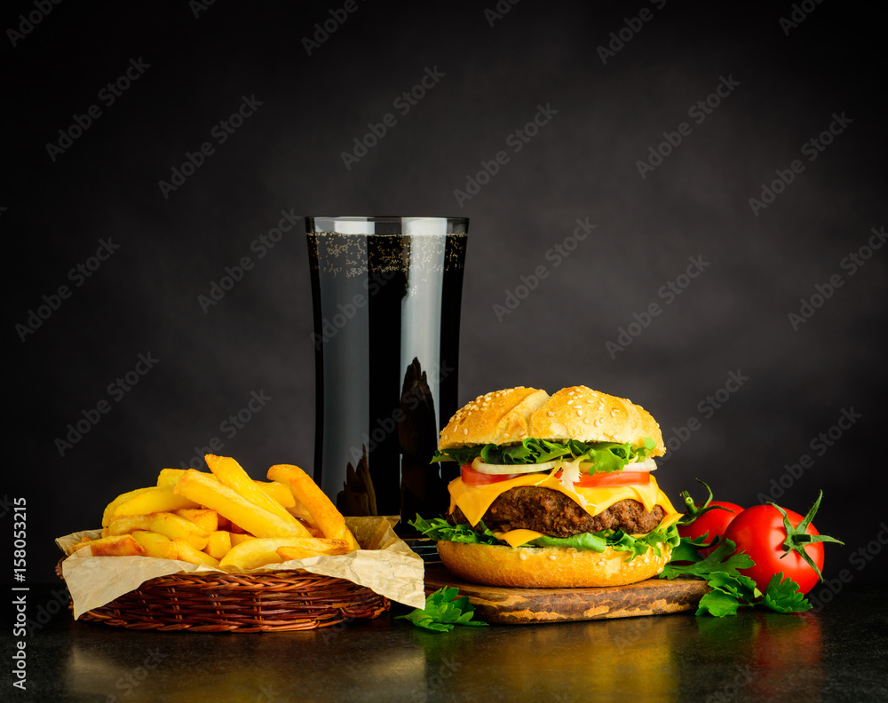 Tasty Looking Cheeseburger with Cola and French Fries