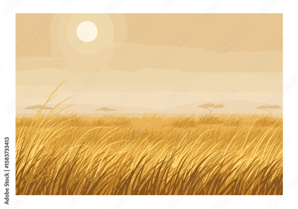 Tableau sur toile A hazy savanna landscape with tall grass and scattered acacia trees under a brig
