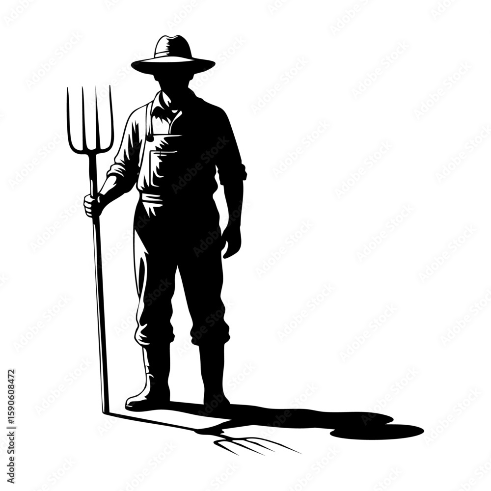 Tableau sur toile Minimalist black and white lineart illustration of a farmer holding a pitchfork