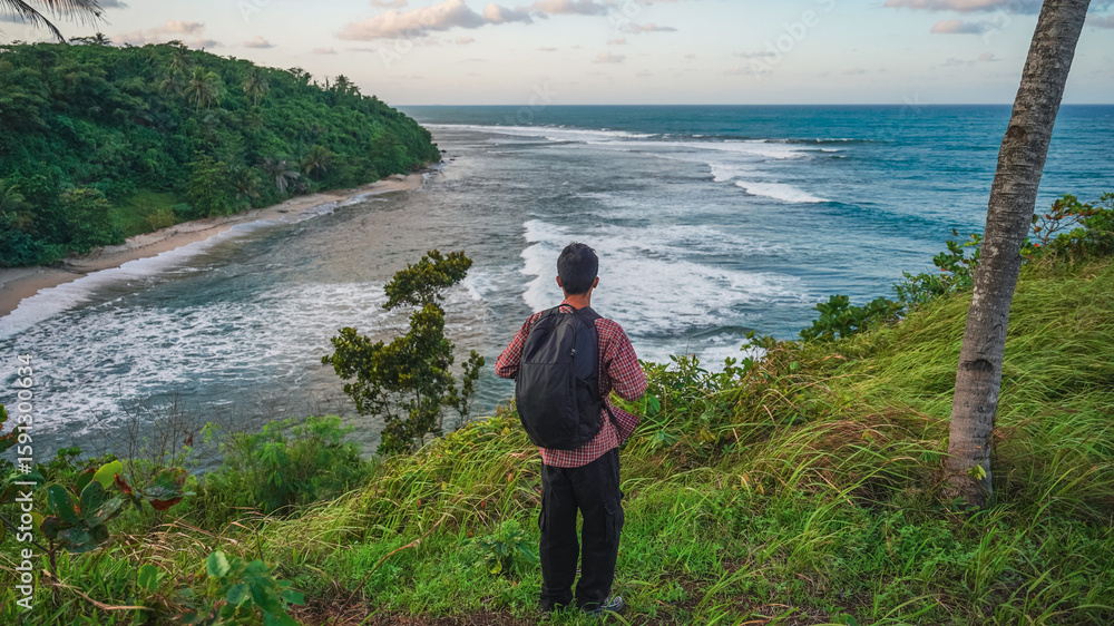 Tableau sur toile Solo hiker on grassy bluff above ocean waves, tropical sky and palm trees swaying gently