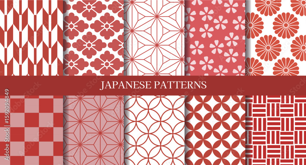 Tableau sur toile シームレスな和柄パターン 赤 セット