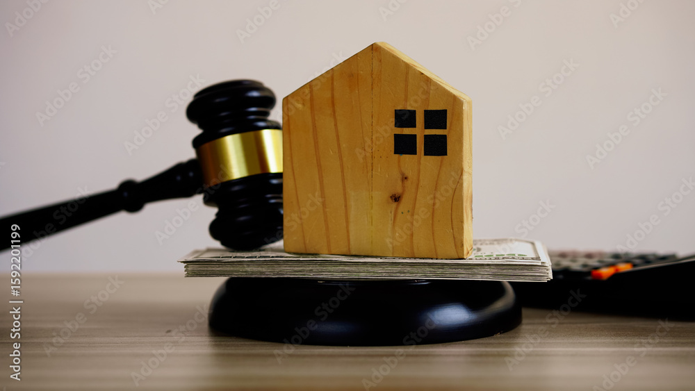Tableau sur toile Mini house on judge’s gavel, legal book beside it “Real-estate law and property auction concept – miniature house on judge’s gavel symbolizing home ownership and legal judgement