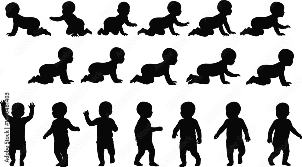 Tableau sur toile Silhouettes of crawling and walking babies in motion, toddler development stages