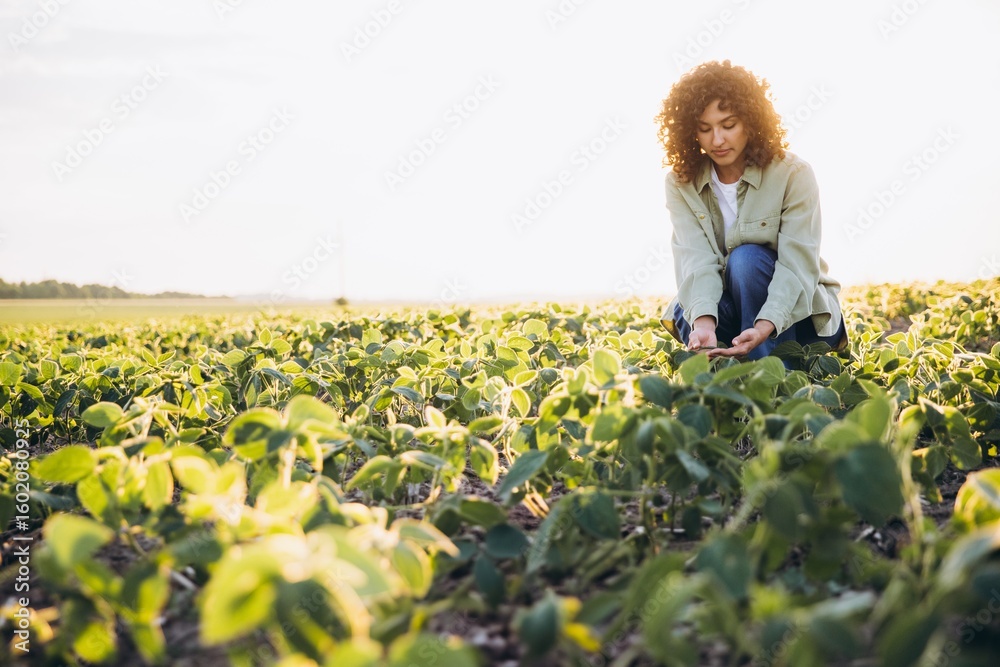 Tableau sur toile Young agronomist woman inspecting soybean plants in cultivated field