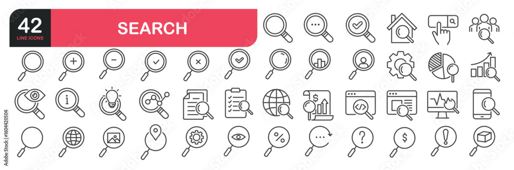 Tableau sur toile Set of line icons related to search, magnifying glass, research, zoom