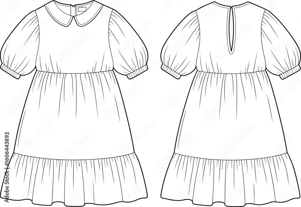 Tableau sur toile Flat sketch of puff sleeve dress with peter pan collar, ruffle hem, back keyhole